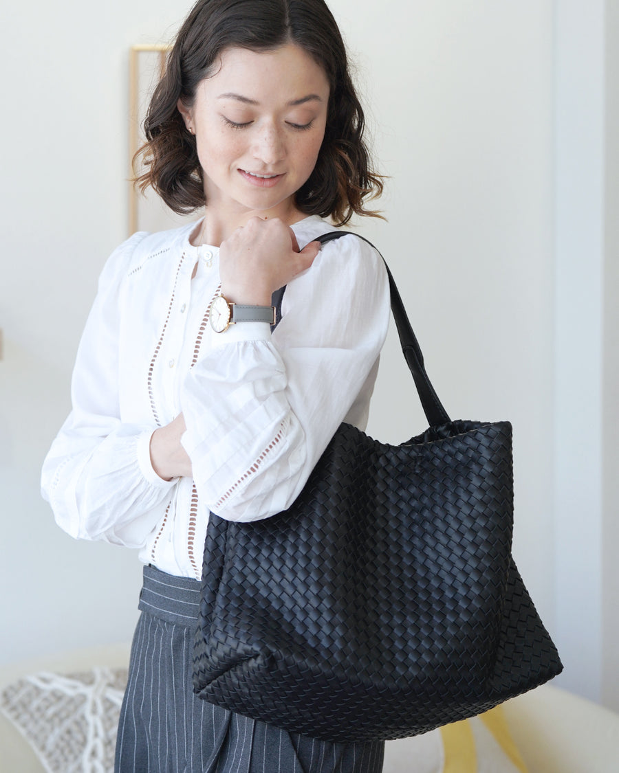 しっかりとした広めのマチで、A4も楽々収まる大容量のサイズ感も魅力的。ワイド幅のショルダーベルトで、荷物を入れても負荷がかかりにくく快適な使い心地。