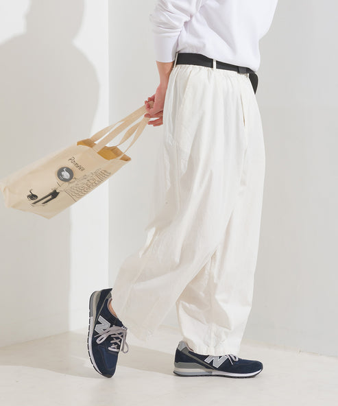 今季は、無地のダンプ生地のみ2パターンの加工を施した生地の製品を用意いたしました。綺麗めで履きたい方は、「ノーマル」がおすすめ。従来の「ウォッシュ」はバイオストーンウォッシュ加工を施し、ヴィンテージ感のある独特な風合いの高密度のコットンクロスになります。ボリュームのある立体的なバルーンシルエットが特徴的なパンツ。ワイドなデザインですが、野暮ったくなりすぎない絶妙なシルエットです。ウエストは後ゴムで前はタックを施しておりウエスト周りをさりげなくカバーしています。ゆったりとしたサイズ感で気になるヒップから太ももにかけても窮屈感なくご使用いただけます。また、足のラインをひろわないので、体系カバーも期待できます。サイドとヒップにはポケットもあり、デイリー使いに嬉しい機能性もばっちり。