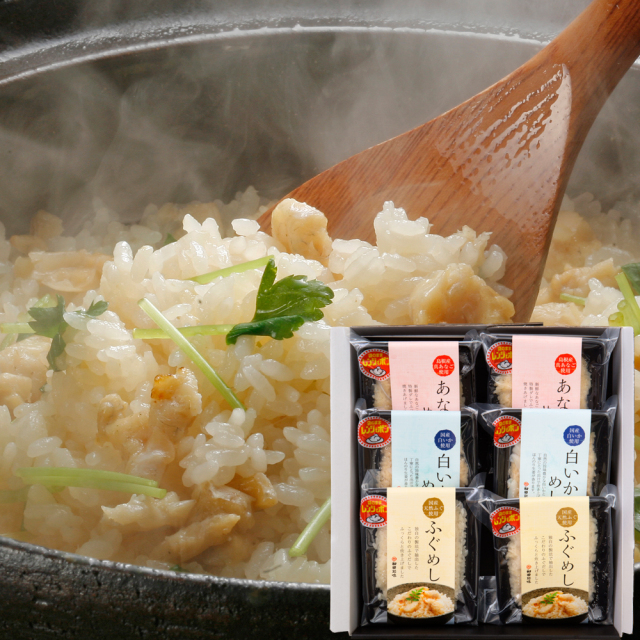 内容量:ふぐめし150g(1人前)×2袋、あなごめし150g(1人前)×2袋、白いかめし150g(1人前)×2袋