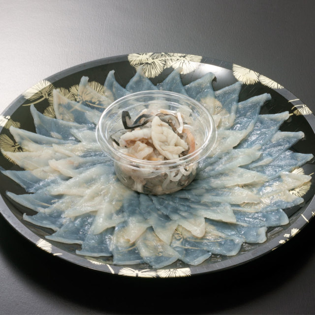 大皿に盛った国産とらふぐの刺身に、湯引き皮・特製ポン酢をセットにしました。