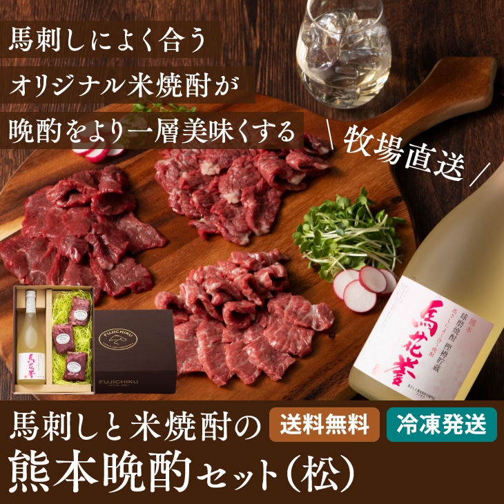 熊本人吉球磨の馬刺しによく合う本格米焼酎と本場熊本の馬刺しのセットです。