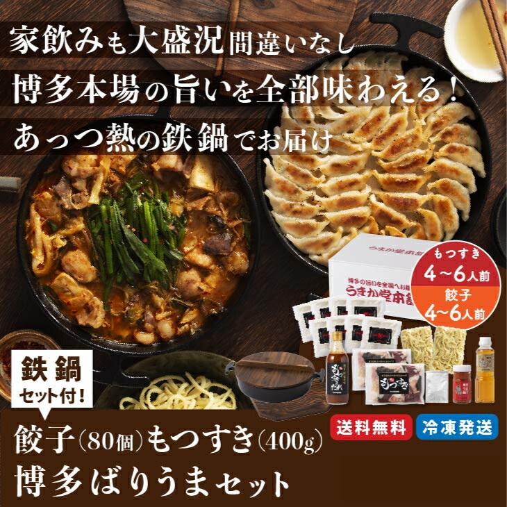 博多名物の「もつすき」と「鉄なべ餃子」を自宅でそのまま楽しめるお得なセットです。
