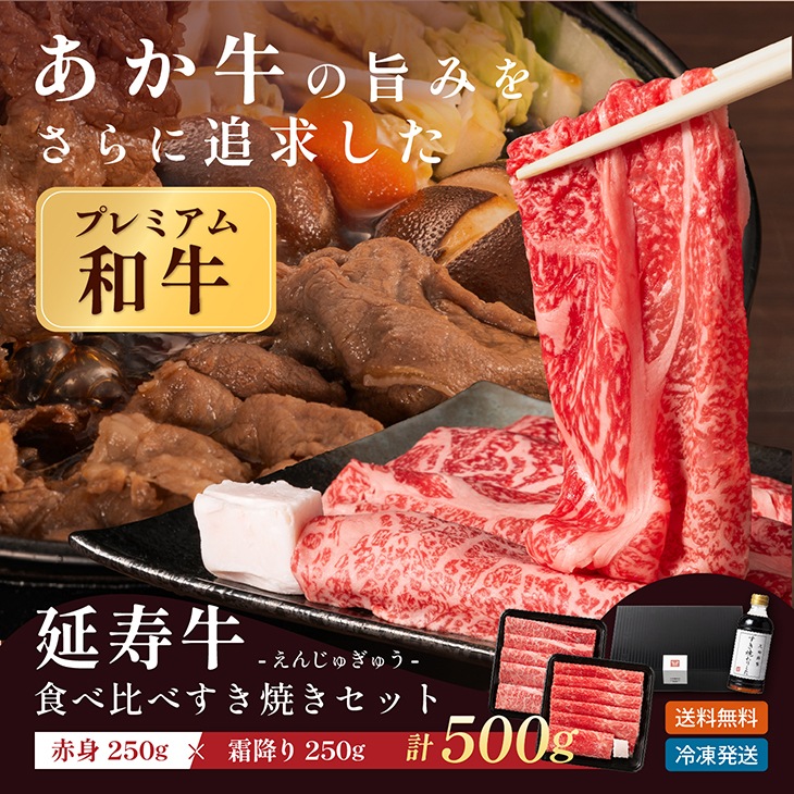 【赤牛 (延寿牛) 霜降り・赤身 うす切り食べ比べセット 500g】 割り下付き