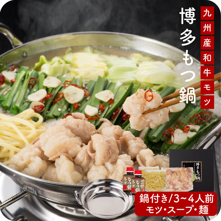 【博多もつ鍋 3~4人前 九州産和牛 専用鍋/醤油ベース/スープ/ちゃんぽん麺付き】