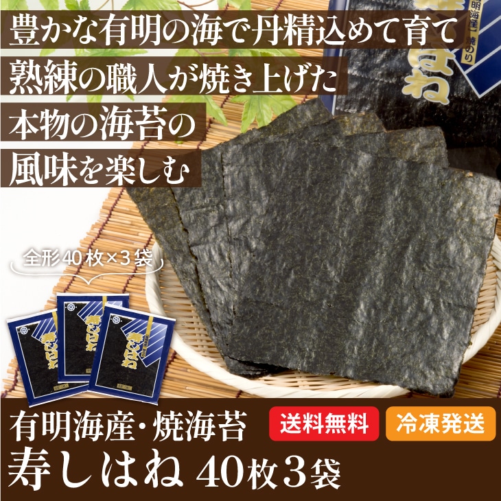 【有明海産・焼海苔「寿しはね」板のり40枚×3袋】: 6,380円(税・送料込) 【有明海産・焼海苔「寿しはね」板のり40枚×3袋】 6,380円(税込) 上質な有明産だけを使った、素晴らしい風味と香り。一番摘みならではの、極上の味わいです。